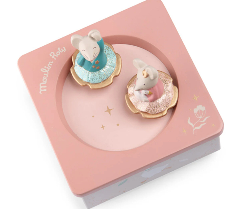 Dit betoverende muziekdoosje uit de serie ‘La petite école de danse’ van het Franse kwaliteitsmerk Moulin Roty is een echte blikvanger voor de kinderkamer. Zodra je het doosje opent en het melodietje begint te spelen, draaien de twee lieve muizenballerina’s sierlijk om elkaar heen; een magisch moment dat blijft fascineren.