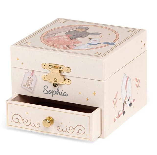 In dit mooie muziekdoosje berg je je mooiste sieraden of andere kleine spulletjes op. Wanneer je de deksel opent draait er een schattig ballerina muisje. Het doosje heeft een laatje, een groot opbergvak en een spiegeltje.