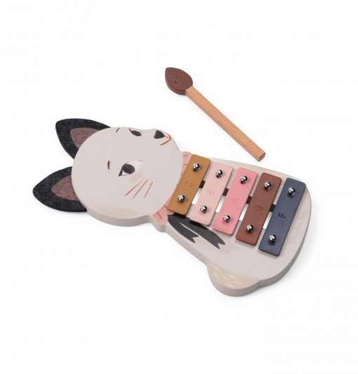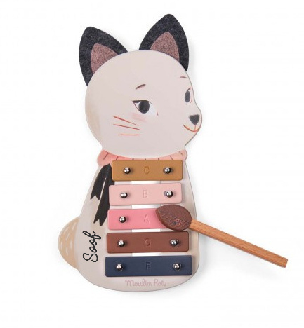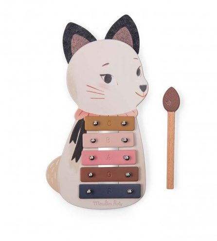 Laat je kleintje spelenderwijs muziek ontdekken met deze prachtige houten xylofoon uit de serie Après la pluie van Moulin Roty! Dit schattige instrument heeft 5 metalen klankplaten en komt met een houten stokje om de mooiste melodietjes te spelen. Op de afgeronde houten basis vind je een lieve illustratie van Plume uit de Après la Pluie collectie, compleet met zachte vilten oortjes.