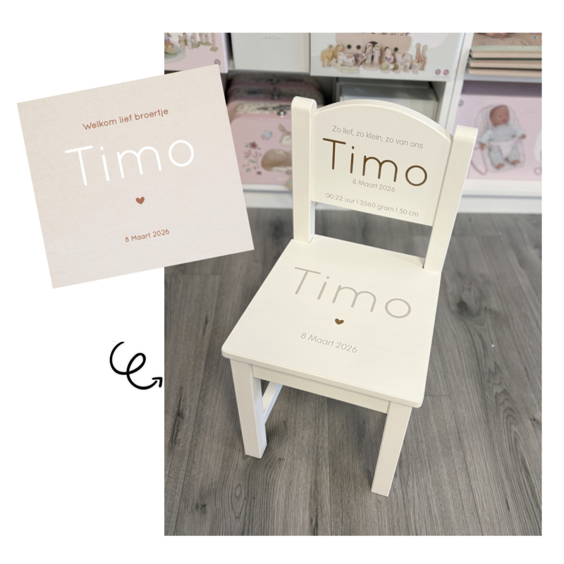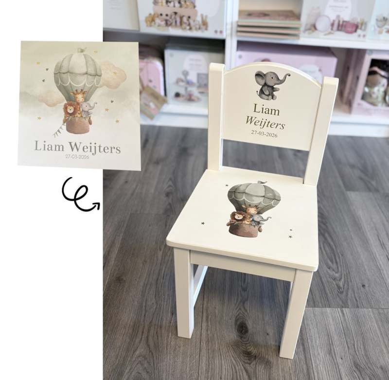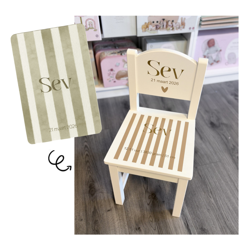 - Maak het stoeltje extra speciaal door het te laten personaliseren op basis van het geboortekaartje. Hoe werkt het? Stuur na het bestellen een mail naar info@theriverhouse.nl met duidelijke foto's (of scans) van het geboortekaartje én je ordernummer. Je ontvangt dan van ons een voorbeeld alvorens het stoeltje daadwerkelijk wordt gemaakt.
