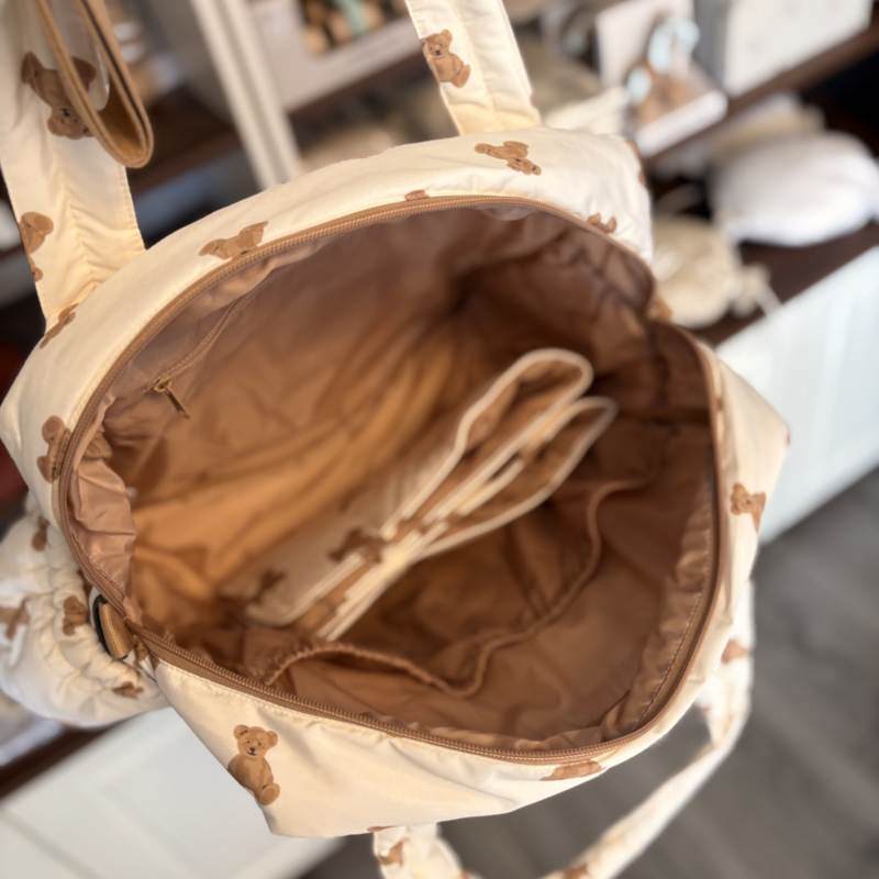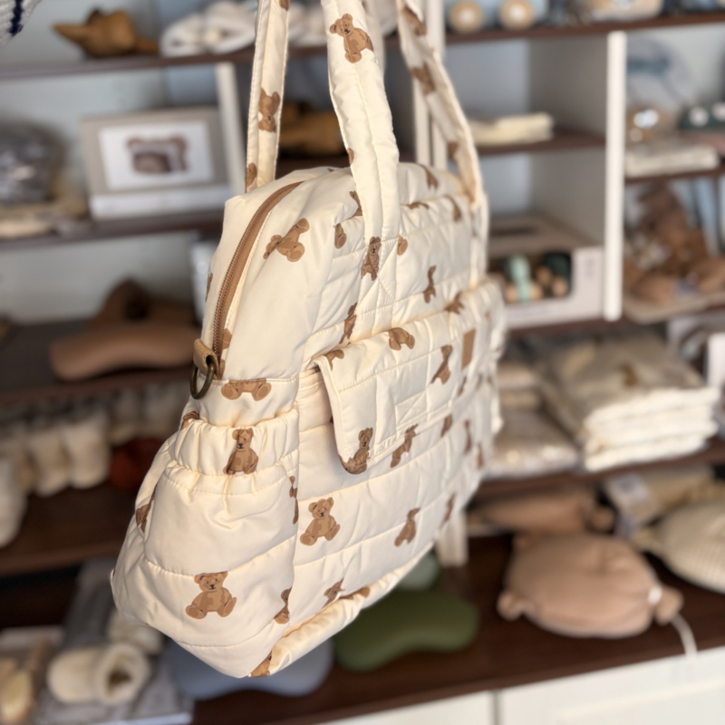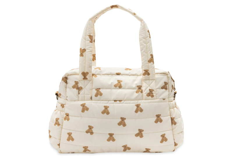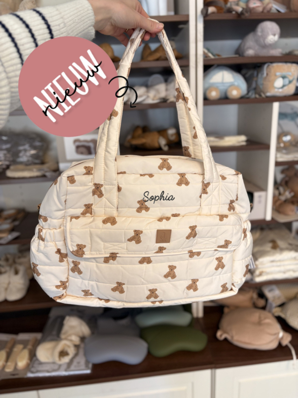 Deze trendy luiertas uit het Mini Teddy Bear thema combineert een schattige uitstraling met volop functionaliteit. De tas is ruim van formaat en biedt genoeg plek voor alle essentials die je onderweg nodig hebt. Aan de voorkant zitten handige vakken met klittenbandsluiting, inclusief een bijpassend verschoningsmatje dat je altijd bij de hand hebt. Dankzij de bionic finish is de tas waterafstotend en dus ideaal voor elk weertype. Je draagt de tas gemakkelijk in de hand of met de verstelbare schouderband. Tip: combineer de tas met onze tassenhaken voor nóg meer gemak tijdens het wandelen.
